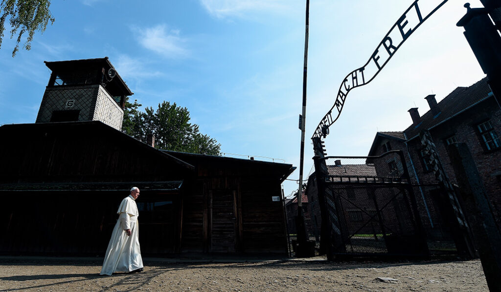 En silencio bajo el letrero «Arbeit macht frei», Francisco visitó el campo de exterminio nazi de Auschwitz. Su rostro reflexivo y la austeridad de la escena reflejaron su compromiso con la memoria y la paz.