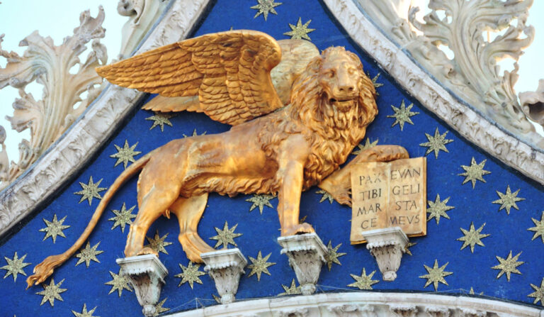 La tradición ha visto a los evangelistas en los cuatro seres vivientes junto al trono de Dios que menciona el Apocalipsis. Cada uno tiene una apariencia, y el león ha sido asociado a san Marcos porque comienza su Evangelio mencionando a san Juan Bautista: la «voz que grita en el desierto» se asemejaría al rugido de un león, y así ha pasado a formar parte de la iconografía cristiana. En el año 828, comerciantes italianos robaron el cuerpo del evangelista y llo llevaron a Venecia, donde sus restos reposan hoy y donde el león se ha convertido en el símbolo de la ciudad.
