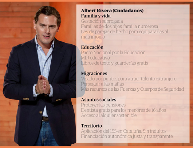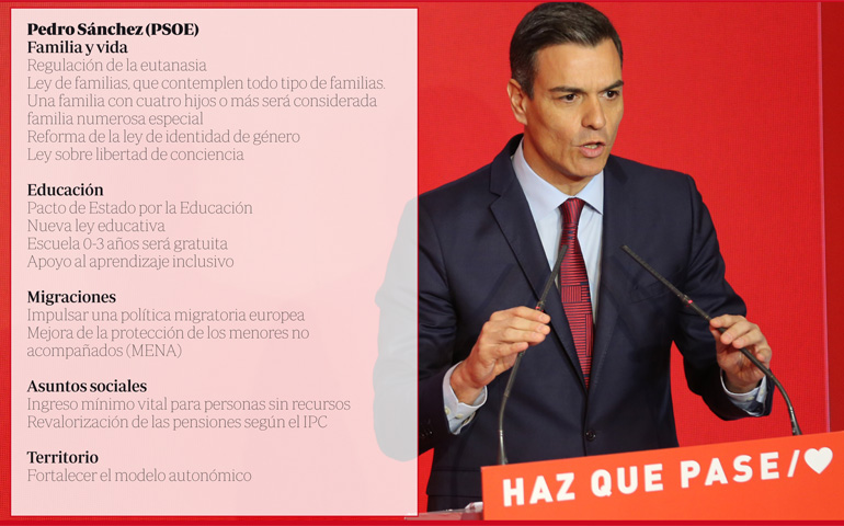 La cuestión de la familia y de la defensa de la vida también está muy presente en los programas electorales en un sentido o en otro. Por ejemplo, la formación política Vox es la que más busca acercarse al elector católico, e incluso manifiesta sus principios de igual modo que la Iglesia: defensa de la vida desde el principio hasta su fin natural y del matrimonio entre hombre y mujer. En cambio, es el Partido Popular el que, sin referencias a que vaya a modificar la ley, realiza una serie de propuestas para que la mujer, por ejemplo, no se vea abocada al aborto con una ley de apoyo a la maternidad o la creación de oficinas municipales de apoyo a la mujer embarazada. Estas dos formaciones apuestan por la creación de un Ministerio de Familia y se oponen a la legislación sobre eutanasia que sí llevan en su programa explícitamente el PSOE y Unidas Podemos. Ciudadanos, por su parte, se queda solo en su defensa de la gestación subrogada.
