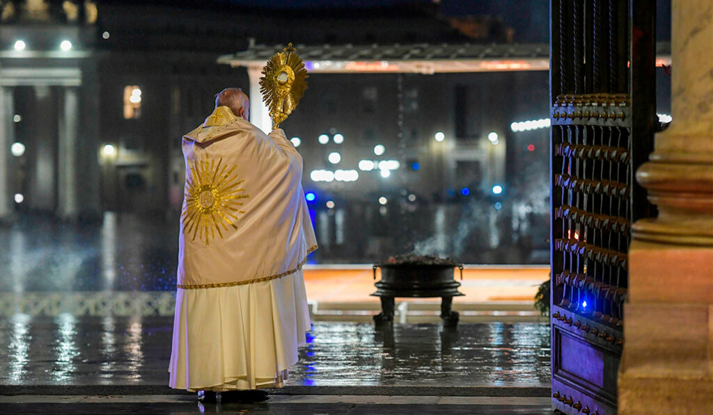 27 de marzo: imparte una bendición extraordinaria urbi et orbi desde una plaza de San Pedro vacía en medio de la pandemia de COVID-19.