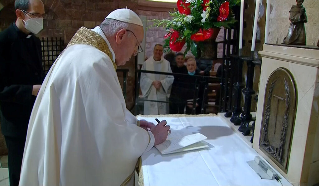 3 de octubre: firma Fratelli tutti en la tumba de san Francisco de Asís. La encíclica aborda la amistad social como pilar para un mundo más justo y pacífico.