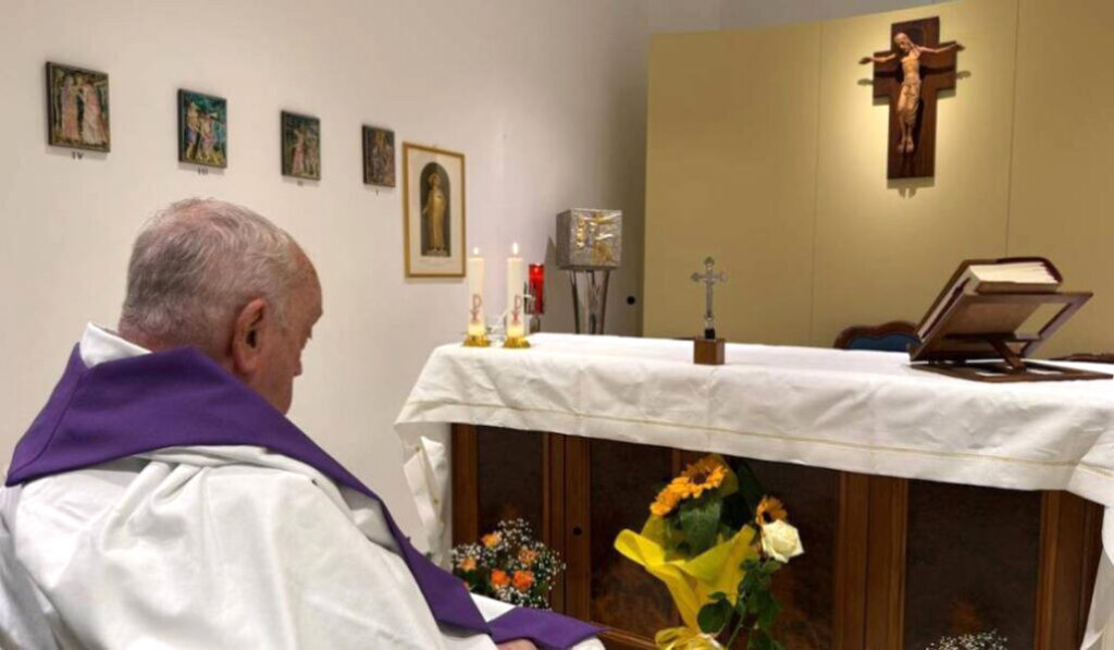 16 de marzo: se publica la primera fotografía del Papa en el hospital tras más de un mes ingresado. Aparece rezando en la capilla de su apartamento.