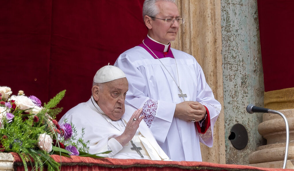20 de abril: Diego Ravelli lee la bendición urbi et orbi desde la logia central de la basílica de San Pedro. Francisco desea una «buena Pascua».