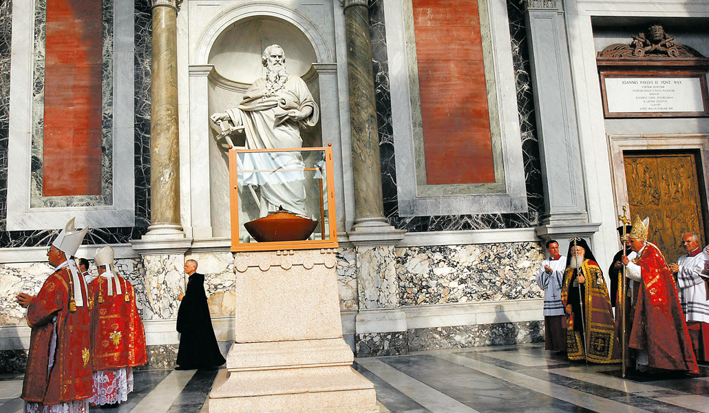 Benedicto XVI y el Patriarca de Constantinopla, junto a la Llama paulina, bajo la estatua de san Pablo.