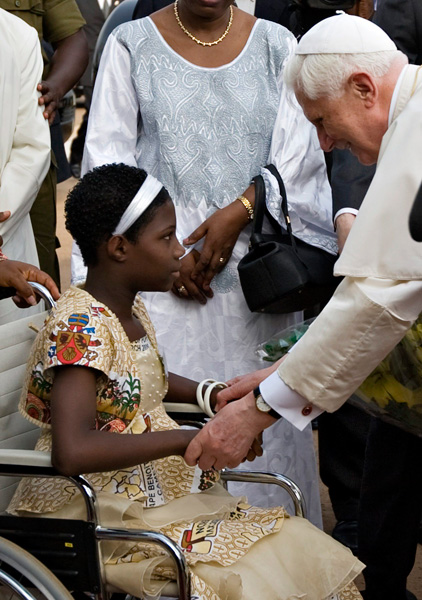Benedicto XVI a una niña en el centro Cardenal Paul Emile Leger, en marzo de 2009, en Yaoundé, Camerún.