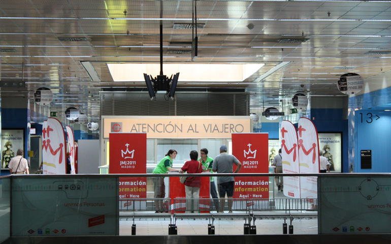 Se les ve a lo lejos. Cinco jóvenes, tres chicos y dos chicas, de pie, con una amplia sonrisa, esperan tras un mostrador. Están en el Intercambiador de Príncipe Pío, lugar de paso de viajeros que llegan desde el sur de la Comunidad de Madrid al centro. Allí, los voluntarios de la parroquia Santa María de Caná, repartidos entre este punto de información y el que está en Moncloa, atienden a todo el que se acerca. «Llevamos aquí una semana y ya han pasado muchísimos peregrinos, y personas curiosas que vienen a preguntarnos qué es todo este tinglado», cuenta uno de ellos. «Nosotros les ofrecemos la agenda de la JMJ, un plano del Metro y, para los que estén más interesados, un CD con los himnos de todas las Jornadas», explica. En los minutos que pasa Alfa y Omega con ellos, más de cinco personas -no peregrinos- que pasan por la estación se acercan a preguntar y se llevan el horario de los actos. Su servicio no sólo orienta a peregrinos, sino a todos aquellos que pasan por allí, como despistados. Muchas veces, no tienen la respuesta a todas las preguntas, pero ése no es su objetivo primordial; sí lo es mostrar su alegría y espíritu de servicio.
