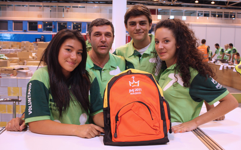 Angélica y Marensy, ambas italianas de 16 años, cuchichean sonrientes mientras montan mochilas de la JMJ, que entregan a las interminables filas de peregrinos que llegan, desde Italia, al pabellón de IFEMA para recoger su acreditación. Llevan en Madrid desde el 7 de agosto, trabajando «en lo que nos pidan», cuentan, mientras Fran, un mallorquín de 17 años, que lleva desde el 3 de agosto en Madrid, las ayuda por si se encasquillan con alguna palabra, y recuerda lo importante que es «ver con nuestros propios ojos cómo se vive la fe en todas partes del mundo».