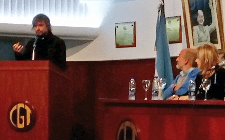 El secretario general de la CGT, Héctor Daer, llegó al salón de imprevisto y se sentó junto a Pepe Di Paola. Allí explicó que el motivo de su demora fue una reunión del concejo directivo de la central que debatió y definió minutos antes la convocatoria a la sexta huelga general contra la política económica del actual gobierno. «Pero no vengo hablar de ello, nuestro respaldo es total a la iniciativa de santificar a Evita, más allá del trámite formal a través del cardenal Poli, no solo por los innumerables milagros que realizó a los trabajadores también por dos ejes centrales, que ella adoptó la doctrina social del catolicismo y la puso en práctica desde el gobierno peronista».