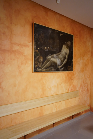 Al fondo de la capilla, un banco alargado, corredero, para que los fieles puedan admirar la capilla desde allí. Encima del banco un gran Cristo, un cuadro del siglo XVII, donde encontramos a Cristo yacente, un hermoso cuadro en el que mirando al Señor uno se enternece. «Los colores, las telas, todo está pensado para que uno pueda estar en paz y orar en profundidad», afirma Gómez.