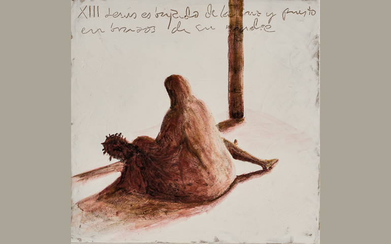 Aquel cuerpo, colocado por el discípulo en el regazo de la madre, lavado de nuevo por las lágrimas de la Magdalena, queda envuelto en una sábana blanca. Una tumba nueva está a punto de recoger el cuerpo recompuesto y limpio de Jesús. Colocan un sudario sobre el rostro y, alrededor de la cabeza de Jesús, un lino envuelve sus miembros muertos, en espera de poderlo ungir con óleos aromáticos y sellarlo para siempre tras una pesada piedra. El cuerpo entregado y la sangre derramada permanecen como último testimonio de las palabras de Jesús. Lentamente, sus discípulos van tomando conciencia de que todo aquello que decía era verdad, que correspondía a la realidad, pero eran palabras referidas al pasado, porque ¡ahora todo se había terminado!