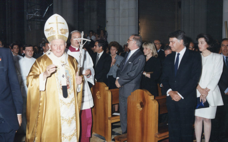 Participé en la solmene celebración en la que hace 25 años san Juan Pablo II bendijo la catedral de Santa María la Real de la Almudena con mi abuelo, ya muy anciano. Aunque yo ya era sacerdote desde hacía cuatro años, no concelebré, sino que le pedí al cardenal Ángel Suquía poder acompañar a mi abuelo entre los fieles. Fuimos andando despacito desde su casa, no muy alejada de la catedral, y en uno de sus bancos esperábamos la llegada del Papa cuando entró el presidente del Gobierno, Felipe González. Fue recibido por una parte de los fieles dentro de la catedral, todos ellos con invitación (no se trató de una algarada callejera), con insultos y abucheos bastante desagradables.